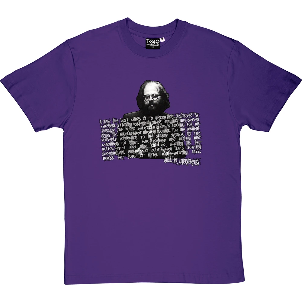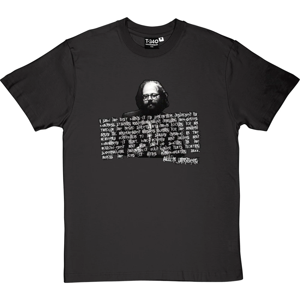 The original leader and spokesperson of the Beat Generation. Allen Ginsberg: radical, nonconformist, free-speech activist, gay rights campaigner and poet. His image on this t-shirt is overlaid with the classic opening lines to his 1956 poem “Howl”: “I saw the best minds of my generation destroyed by madness, starving hysterical naked, dragging themselves through the negro streets at dawn looking for an angry fix, angelheaded hipsters burning for the ancient heavenly connection to the starry dynamo in the machinery of night, who poverty and tatters and hollow-eyed and high sat up smoking in the supernatural darkness of cold-water flats floating across the tops of cities contemplating jazz”