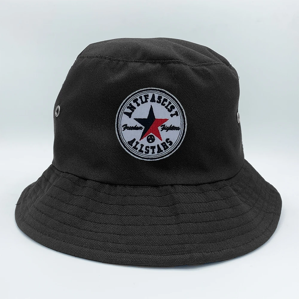 A bucket hat featuring a parody of a famous sportswear brand, featuring the red and black anarchist star alongside the slogan “Antifascist Allstars: Freedom Fighters”.