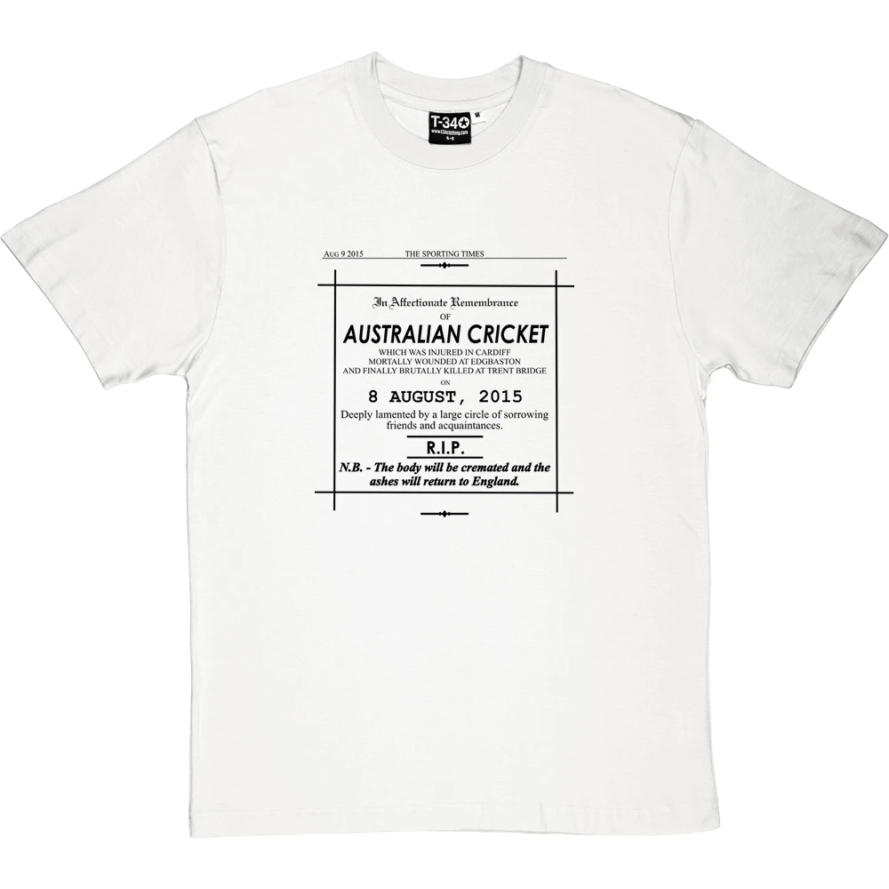 Aug 9 2015: In affectionate remembrance of Australian cricket, which was injured in Cardiff, mortally wounded at Edgbaston, and finally brutally killed at Trent Bridge on 8 August, 2015. Deeply lamented by a large circle of sorrowing friends and acquaintances. R.I.P. (N.B. – the body will be cremated and the ashes will return to England.)