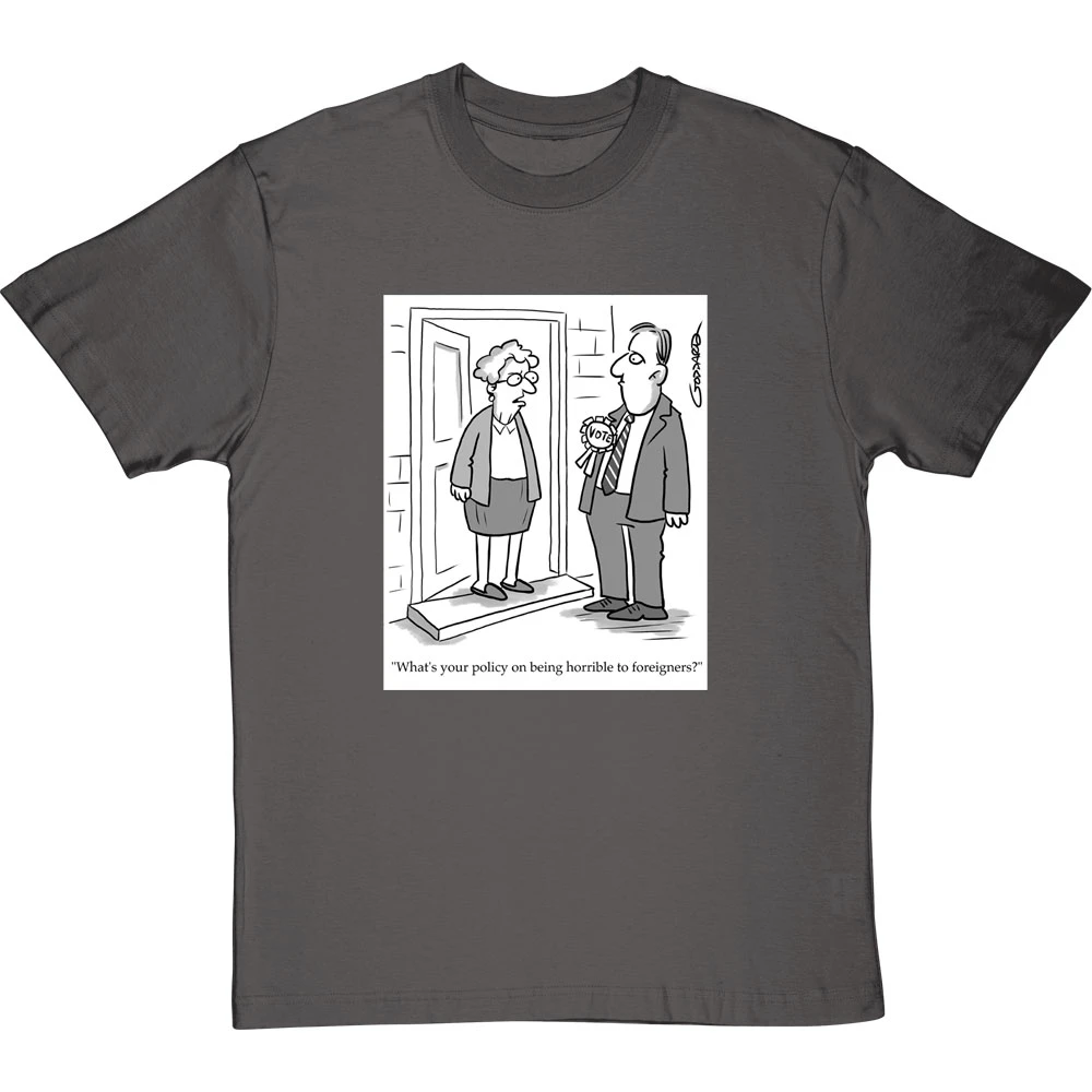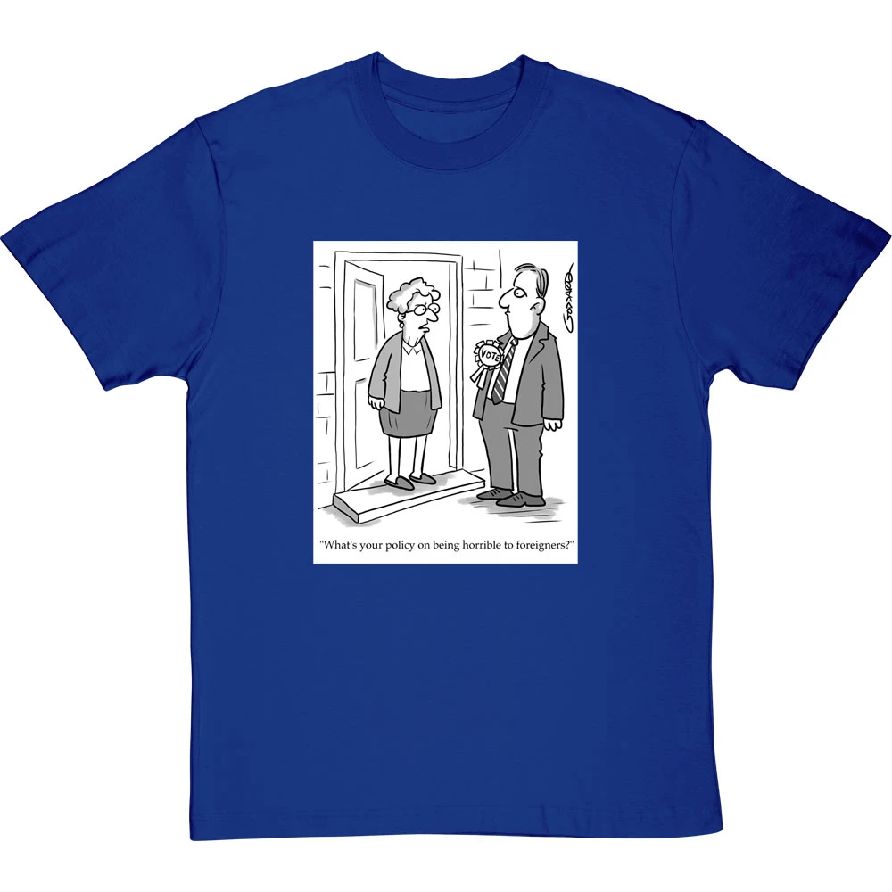 The average doorstop canvasser’s lot when confronted with the wider public: “What’s your policy on being horrible to foreigners?”. A design based on a cartoon by cartoonist Clive Goddard.