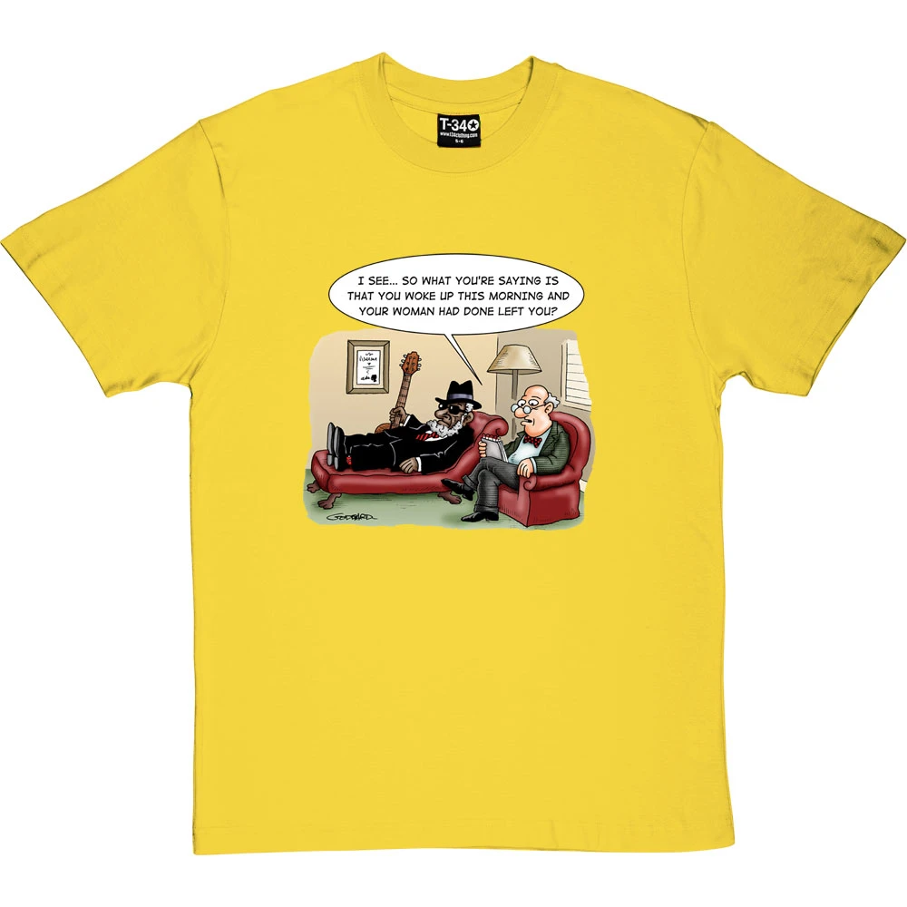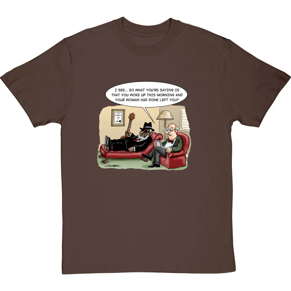The tale of woe, as told by an old-school Bluesman to his psychotherapist: “I see… so what you’re saying is that you woke up this morning and your women had done left you?”. A cartoon by renowned cartoonist Clive Goddard.