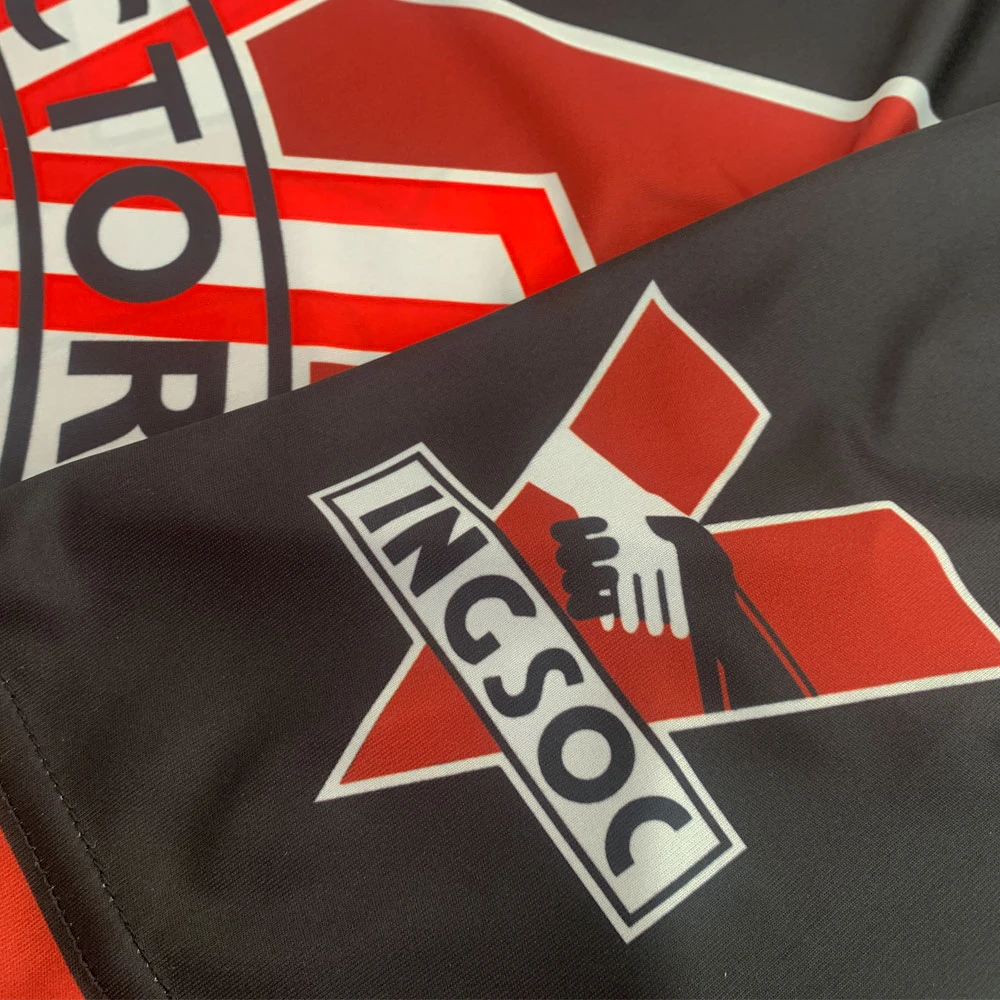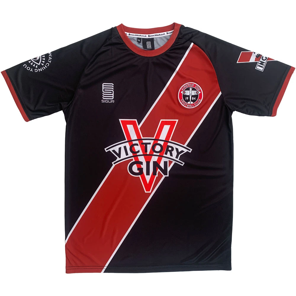 This exclusive football shirt is inspired by George Orwell’s classic dystopian novel “Nineteen Eighty-Four”. Printed in the black and red colour scheme so often used in depictions of Oceania, the shirt featured the embroidered badge of “Airstrip One Football Club” – based on the name of the country once known as Great Britain where the novel is set. The main shirt sponsor is “Victory Gin”; one of the few vices allowed by the party, although more as a means of suppressing emotion and rebellion rather than as a way of deriving pleasure. The sleeve prints feature the logo of Ingsoc (Newspeak for “English Socialism”: the political philosophy of Oceania involving cult-like worshipping and veneration of the ruler, Big Brother), with the other sleeve showing a stylised eye with the words “Big Brother Is Watching You” around it.