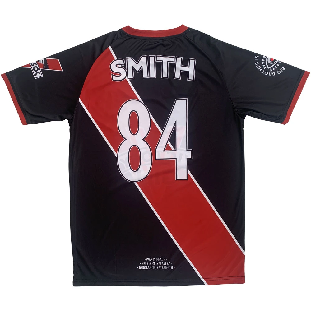 The rear of the shirt features the name Smith – after the main protagonist of the story, Winston Smith – and, naturally, the number 84. At the bottom of the rear of the shirt is written the mantra of Ingsoc: “War is Peace; Freedom is Slavery; Ignorance is Strength”.