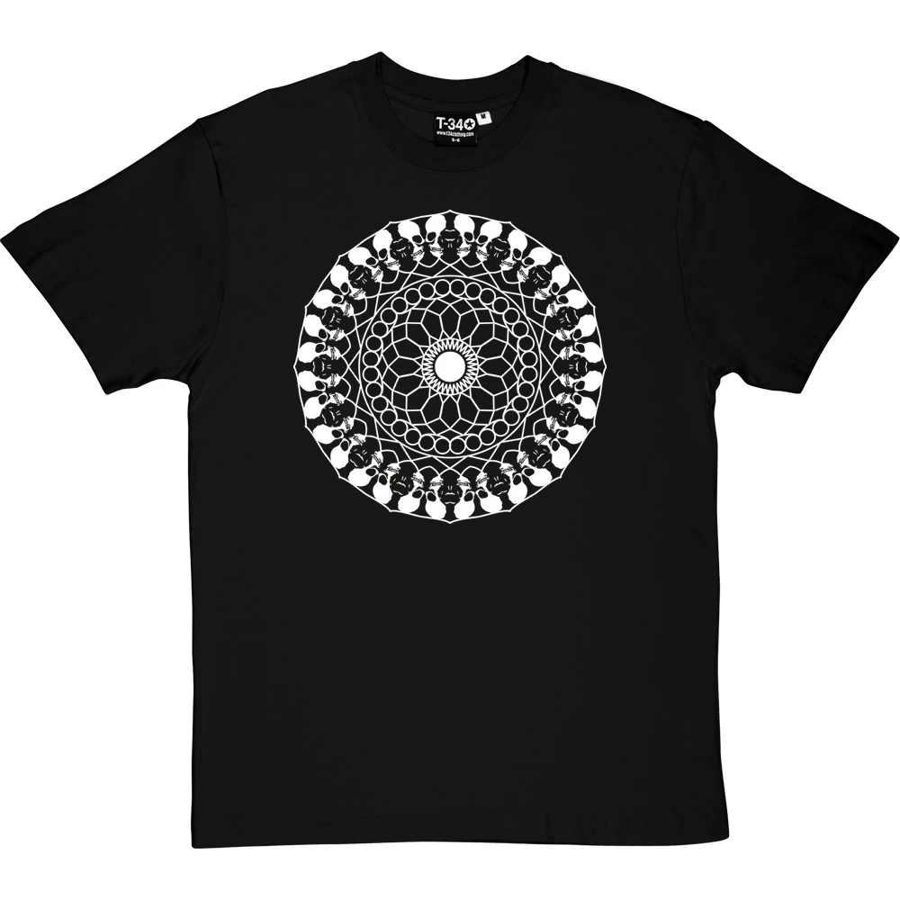A repeating circular mandala-inspired design featuring repeating images of circles, stars and skulls.