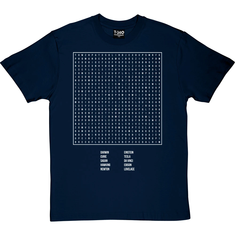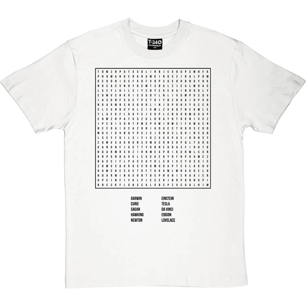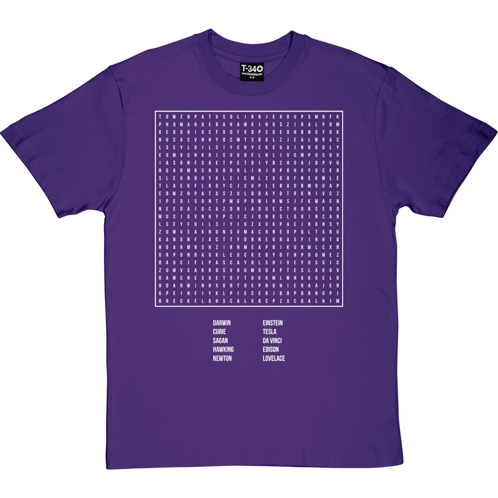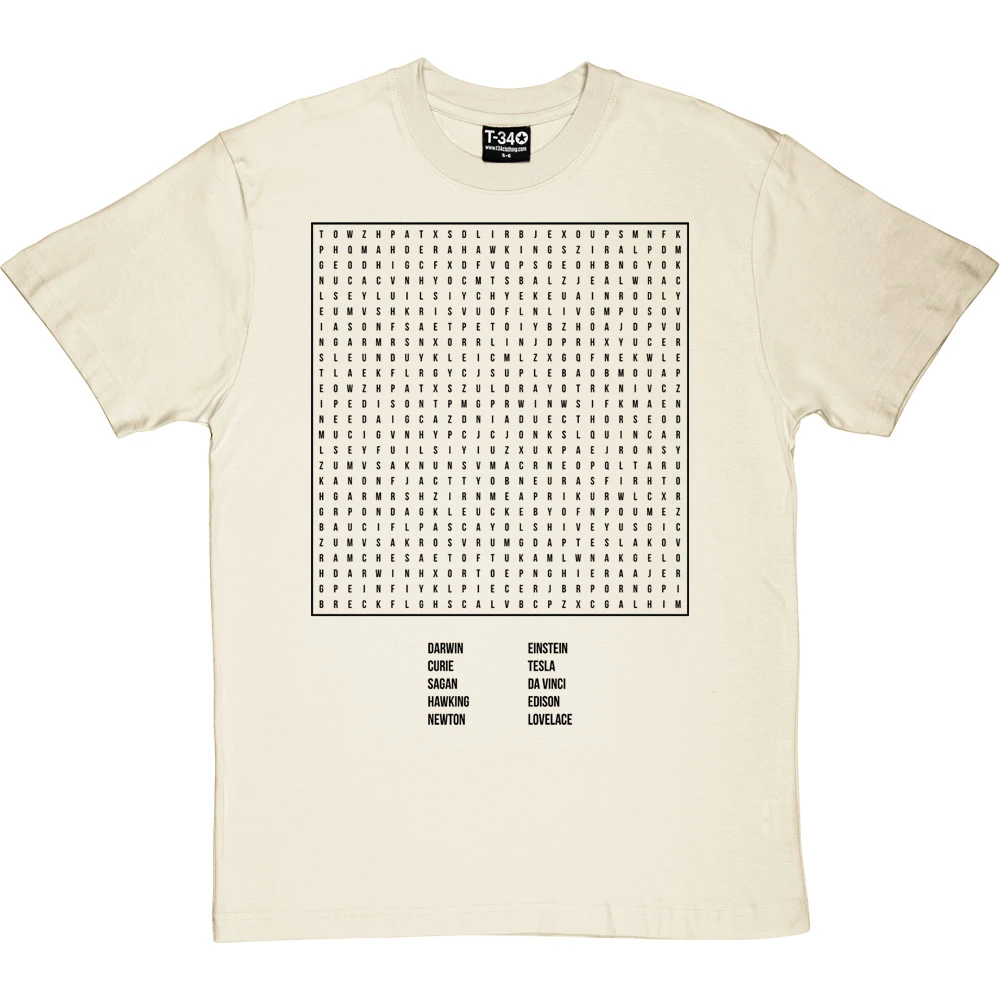 A selection of scientists, arranged in a word search. Darwin, Curie, Sagan, Hawking, Newton, Einstein, Tesla, Da Vinci, Edison and Lovelace.
