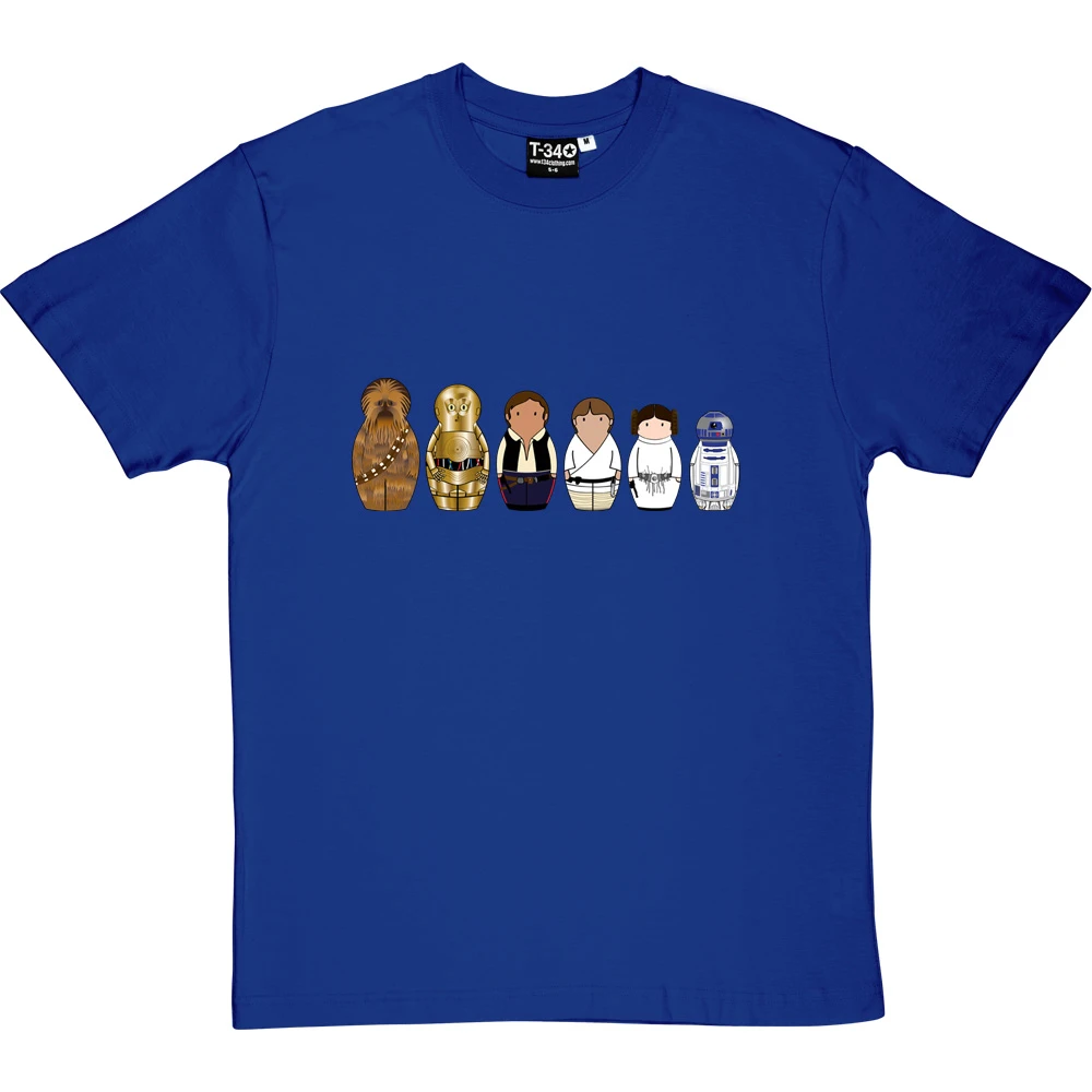 Here we have six of the principle figures on the side of the Rebel Alliance from the original Star Wars trilogy in the style of Russian nesting dolls: Chewbacca, C3-P0, Han Solo, Luke Skywalker, Princess Leia and R2-D2.