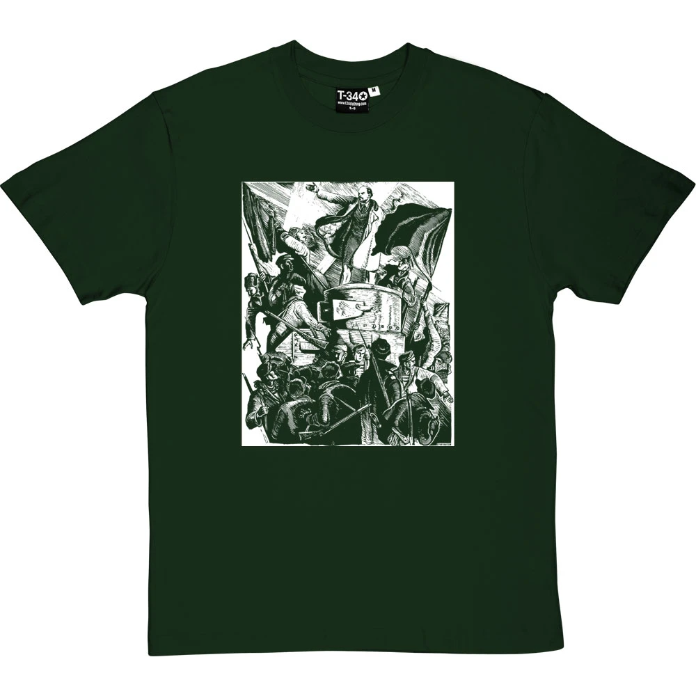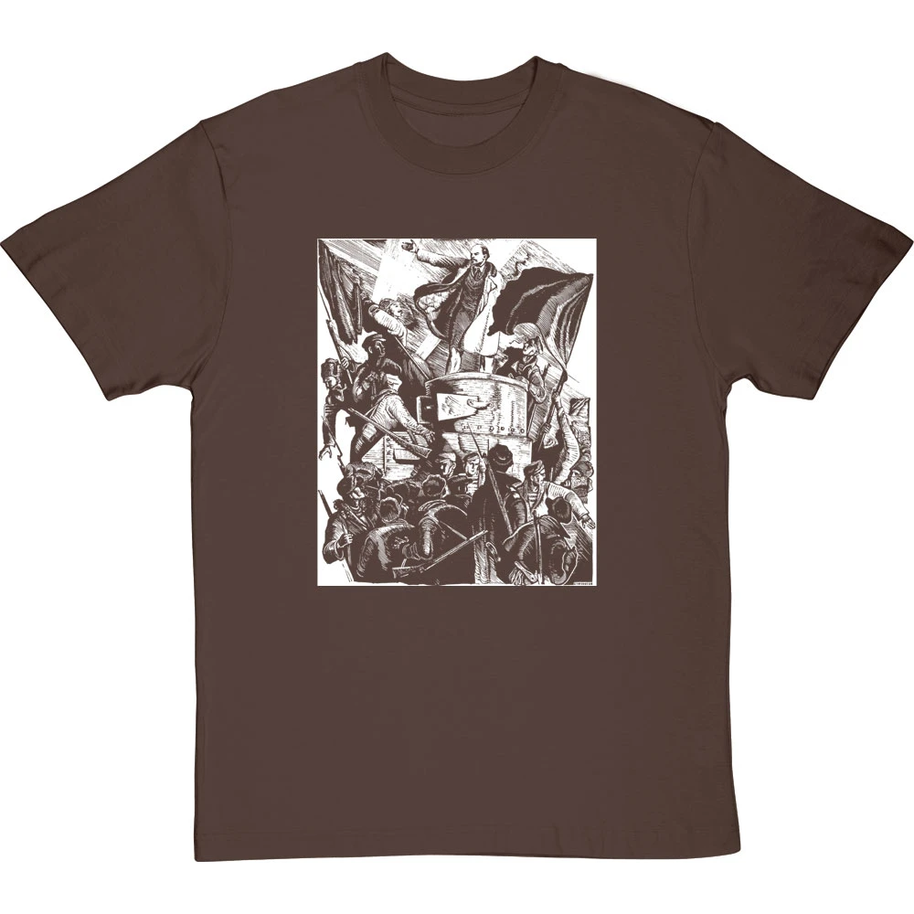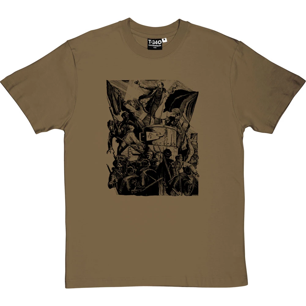 Based on a steel engraving by Russian artist Pyotr Staronosov, this print depicts Lenin’s return from exile and his appearance at Finland Station in Petrograd on 3 April 1917.