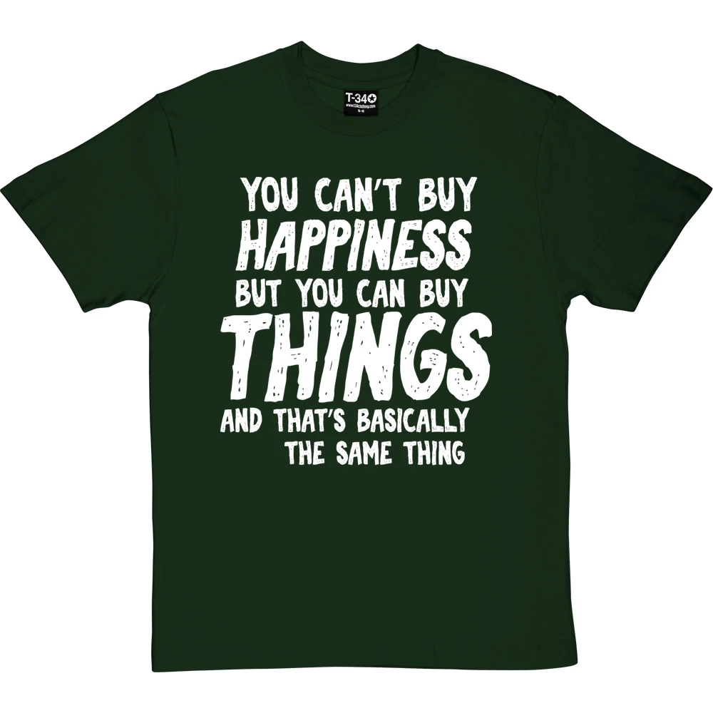 The personalisation should fit into the sentence ‘You can’t buy happiness but you can buy ________ and that’s basically the same thing’. If it does not fit within the sentence, we will contact you to discuss before we print the garment.